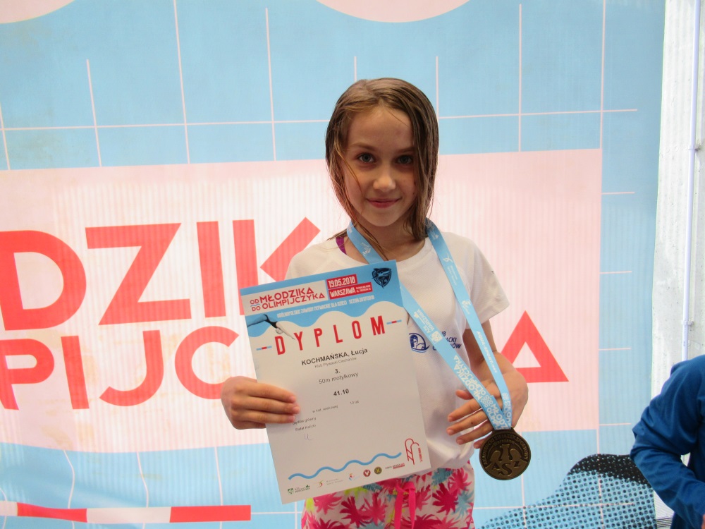 W sobotę 19.05.2018 r. nasi zawodnicy w składzie: Butryn Wiktoria, Bońkowska Antonina, Olszak Natalia, Kurowska Alicja, Dziewanowska Martyna, Kochmańska Łucja, Zarzecka Roksana i Jurski Franciszek reprezentowali Klub Pływacki Ciechanów na ogólnopolskich zawodach "Od Młodzika do Olimpijczyka" w Warszawie. Padło wiele życiowych czasów na 50 metrowej pływalni, zatem progresja zawodników ponownie wzrosła. PROGRESJA W pierwszej 16 zawodów znaleźli się: Kochmańska Łucja, która wywalczyła brązowy medal płynąc 50 m stylem motylkowym, uzyskując czas 41.10, jak również 11 miejsce na 50 m stylem grzbietowym (44.66); Bońkowska Antonina - 14 miejsce, płynąc 100 m stylem klasycznym z czasem 1.42.89 oraz Kurowska Alicja, która zajęła 14 miejsce na 50 m stylem klasycznym (53.23) i 15 miejsce na 50 m stylem motylkowym (51.77)